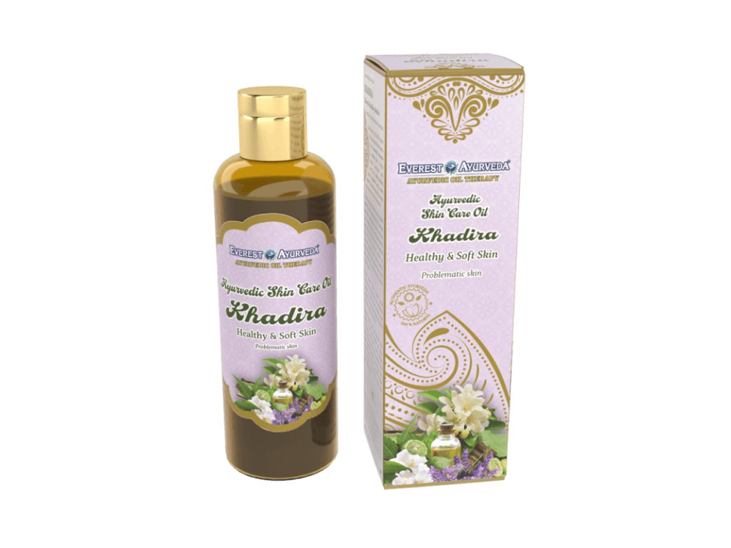 Tradiční ájurvédský olej Khadira, známý jako „kožní tonikum“, je určený na regeneraci citlivé, aknózní, podrážděné a problematické pokožky se sklonem k dermatologickým potížím. Obsahuje jedinečnou kombinaci bylin s antiseptickými a antifungálními účinky. Přispívá ke zklidnění pokožky při jejím svědění, zarudnutí, popraskání nebo poranění. Pomáhá minimalizovat pigmentové skvrny, ochraňuje kožní mikroflóru a prospívá celkovému zdraví kožní tkáně.